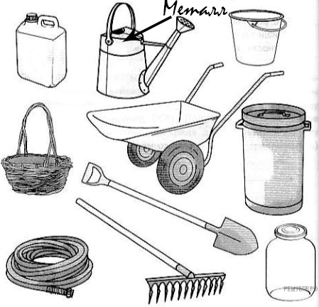 Внимательно рассмотри рисунки предметов. Это изображения садовых и огородных инструментов и принадлежностей. Стрелкой с надписью «металл» отмечена лейка, которая может быть сделана из этого материала. По образцу отметь любой предмет (или его часть), который может быть сделан из пластика, и любой предмет (или его часть), который может быть сделан из стекла.