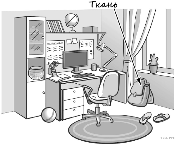 Рассмотри рисунок, на котором изображён рабочий уголок школьника. Рюкзак изготовлен из ткани. Он отмечен на рисунке стрелкой с соответствующей надписью.