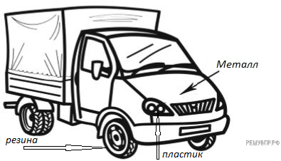 Внимательно рассмотри рисунок, на котором изображён автомобиль. Крышка фары автомобиля может быть изготовлена из пластика. Она отмечена на рисунке стрелкой с соответствующей надписью. Какие предметы или детали среди изображённых на рисунке могут быть сделаны из металла, а какие — из резины? Укажи на рисунке стрелкой любой предмет (деталь) из металла и любой предмет (деталь) из резины. Подпиши название соответствующего материала рядом с каждой стрелкой.