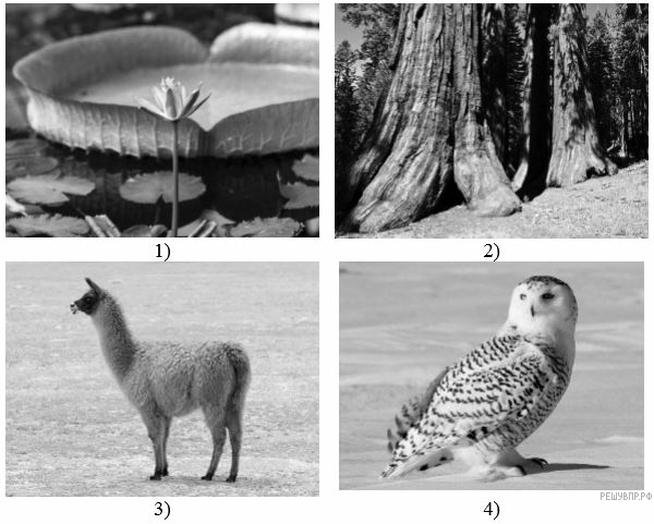 Далее представлены изображения полярной совы, ламы, Виктории Регии и секвойи. Запиши на строчках ниже название каждого из этих растений и животных рядом с номером фотографии, на которой оно изображено.