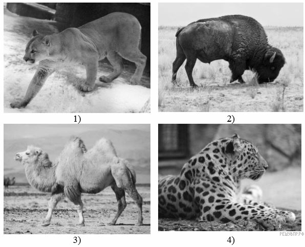 Далее представлены изображения дальневосточного леопарда, пумы, бизона и верблюда. Запиши на строчках ниже название каждого из этих животных рядом с номером фотографии, на которой оно изображено.