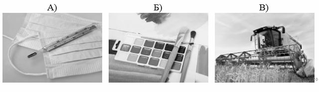На фотографиях изображены предметы, с которыми работают представители разных профессий. Выбери ОДНУ из фотографий и запиши букву, которой она обозначена. Представители какой профессии работают с изображёнными на выбранной фотографии предметами? Если ты знаешь много профессий, представители которых работают с выбранным(-и) тобой предметом(-ами), назови любую из них. Какую работу выполняют люди этой профессии? Чем работа людей этой профессии полезна обществу?